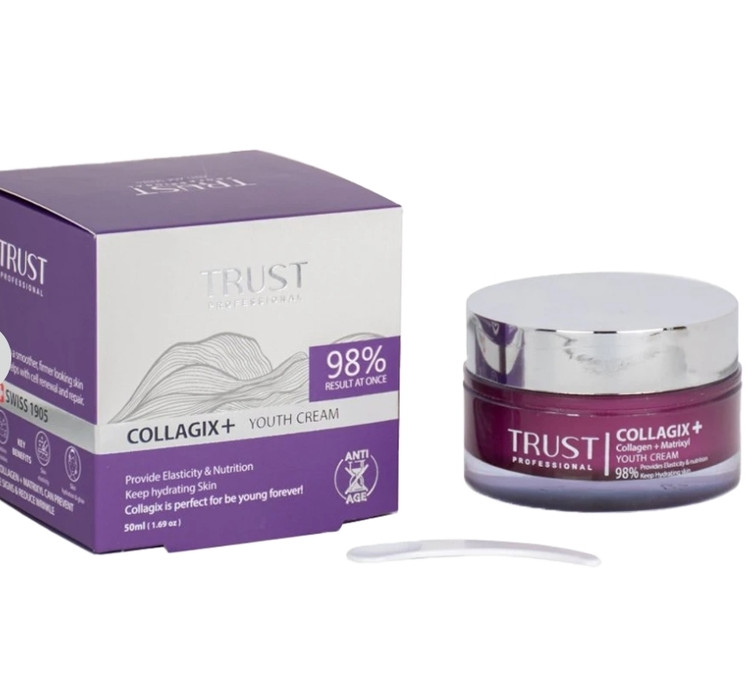 و در نهایت، پلی پپتاید آرژینین و لایزین موجود در کرم جوانساز کلاژن تراست، از ایجاد چینوچروک در پوست جلوگیری کرده و به حفظ شادابی و سلامت پوست کمک میکند. در کنار مواد مؤثره مطرحشده، این محصول تراست، با عصاره دانه لوپینوس آلبوس، به حفظ استحکام و افزایش خاصیت کشسانی پوست، با آسپارلین، به بهبود سوختوساز سلولهای پوستی و تکثیر آنها، با روغن آووکادو، به حفظ استحکام و پایداری پوست و با هلیانتوس آنوس سید اویل، به بهبود آبرسانی و جلوگیری از پیری پوست، کمک میکند.